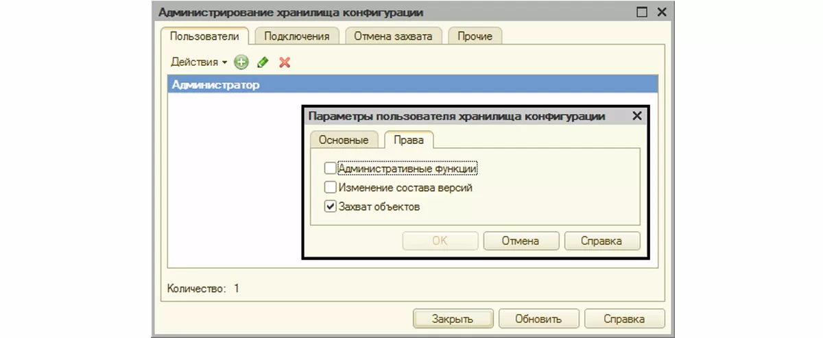 Разработчики, создавая собственные объекты метаданных, чтобы не возникло ситуации одновременного изменения объекта в хранилище, могут воспользоваться возможностью его захвата. После окончания работы над объектом, он перемещается обратно в хранилище, и метка захвата снимается. В любой момент можно восстановить предыдущую версию конфигурации из ее хранилища. Благодаря этому осуществляется контроль доступа к объектам конфигурации при ее разработке или модификации, и тем самым обеспечивается синхронная работа разработчиков.