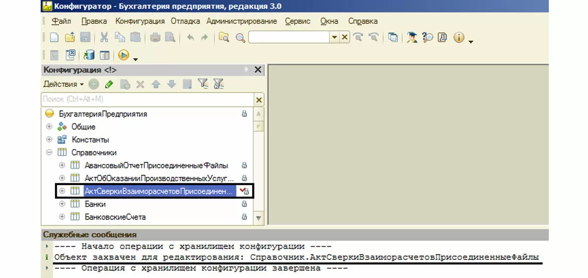 В итоге захвата мы видим на объектах конфигурации метку «Объект захвачен». Во время захвата объекта никто другой не может его корректировать. Данные действия можно проделать как с целым объектом, так и с его отдельными объектами или формами. После окончания работы, он перемещается обратно в хранилище и метка о захвате снимается.