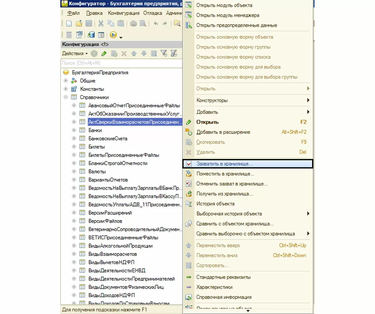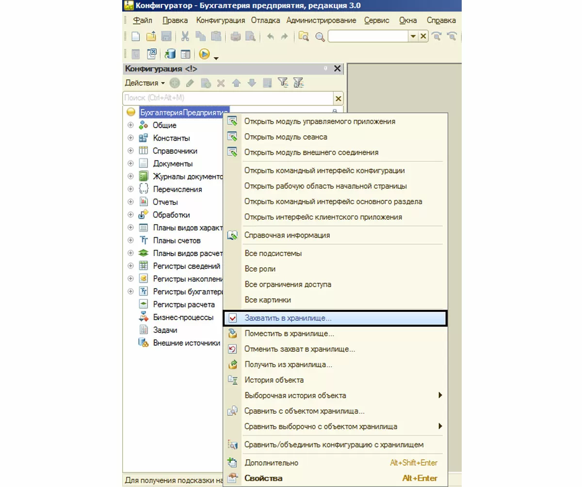 Для того чтобы начать работать с объектом, необходимо выполнить его захват, чтобы другой пользователь не смог вносить в него изменения. Если нажать на корневом элементе правой кнопкой мышки и выбрать команду «Захватить в хранилище», то блокируются все объекты конфигурации.