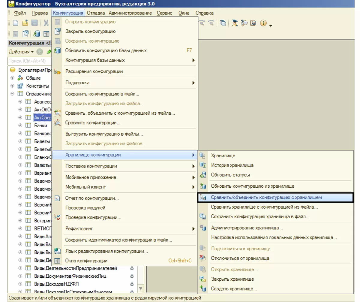 В конце нам надо сопоставить конфигурации и выполнить их объединение. Команда «Сравнить/объединить конфигурацию с хранилищем...».