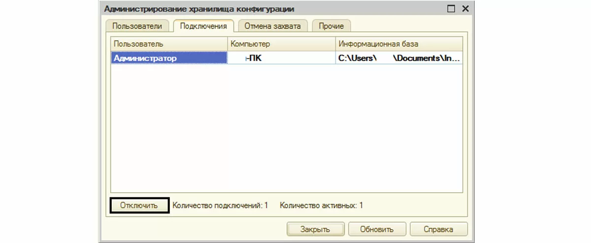 На закладке «Подключения» можно отслеживать подключившихся пользователей и при необходимости можно их отключить (кнопка «Отключить»). Или на закладке «Отмена захвата» отменить захват объектов.