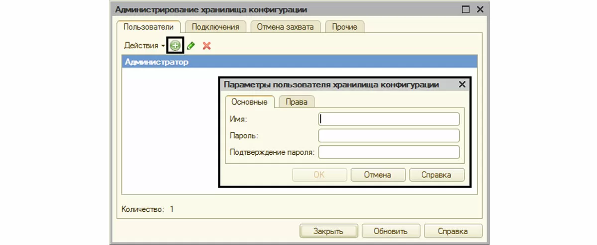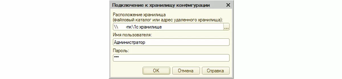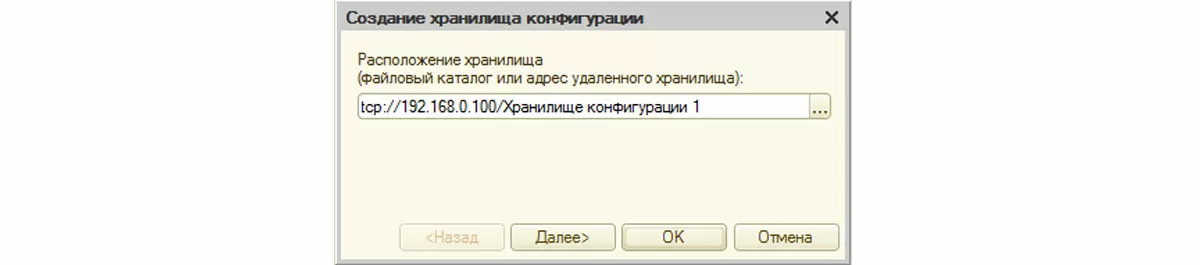 Если хранилище располагается на сервере, путь указывается в формате: tcp://192.168.0.100/Хранилище конфигурации 1.