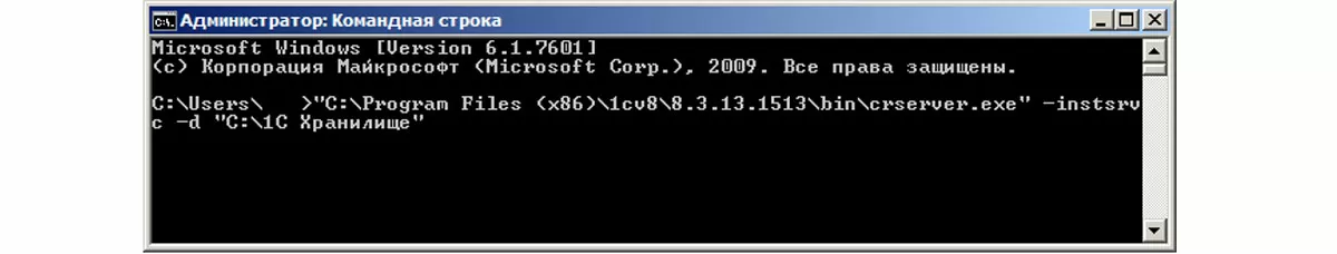 Для регистрации службы сервера хранилища конфигурации, в командной строке пишем: "C:\Program Files (x86)\1cv8\8.3.13.1513\bin\crserver.exe" -instsrvc -d "C:\1С Хранилище".