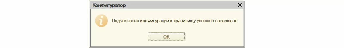 О подключении появится соответствующее сообщение: «Подключение конфигурации к хранилищу успешно завершено».
