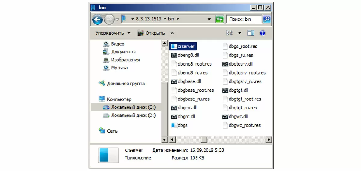 После окончания установки нам нужно зарегистрировать сервер. Файл службы находится в каталоге «bin» установленной платформы - crserver.exe.