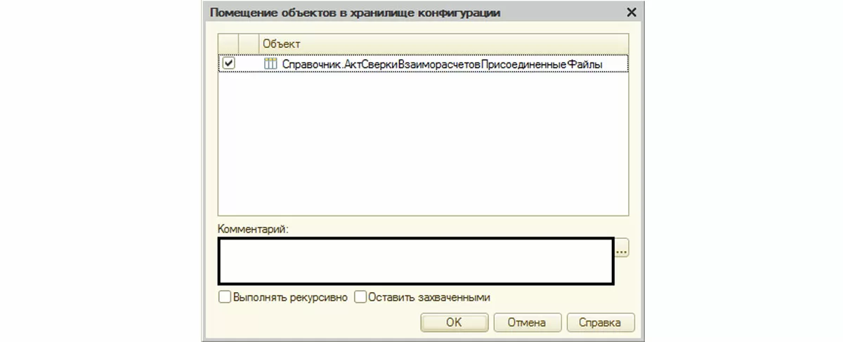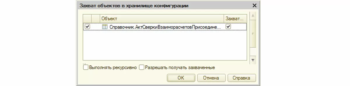 В этом случае захватывается в хранилище указанный объект. При этом мы можем задать параметры: выполнять рекурсивно, то есть захватить все подчиненные объекты и формы, или разрешить получить такие объекты.