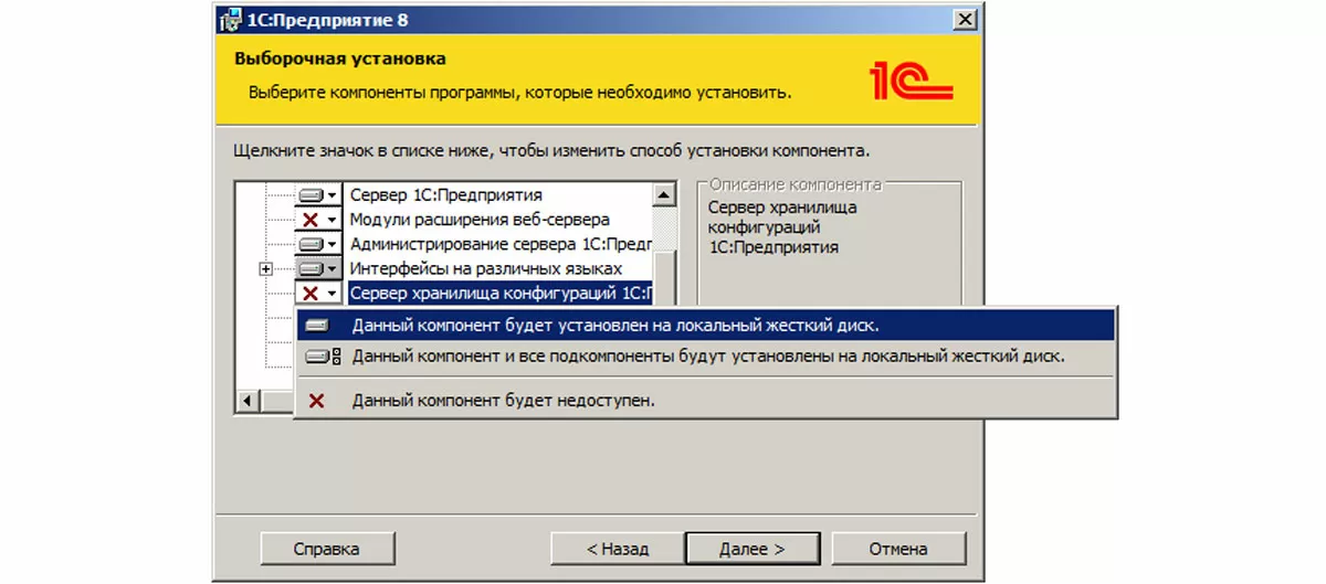 Если в хранилище будут работать несколько человек, удобнее располагать удаленное хранилище на сервере с доступом через интернет. При этом следует отследить, чтобы платформа была одинакова на всех компьютерах, с которых будет осуществляться работа. При установке платформы необходимо выбрать установку компоненты – «Сервер хранилища конфигураций 1С:Предприятия».