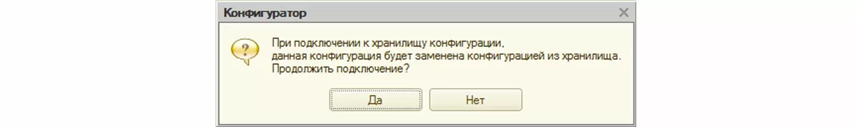 При этом текущая конфигурация заменяется конфигурацией из хранилища. На вопрос программы о подключении отвечаем – «Да».