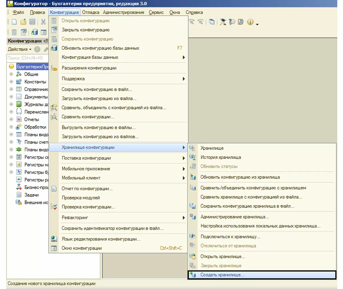 Откроем нашу базу в режиме Конфигуратора и в пункте меню Хранилища выберем команду создания.