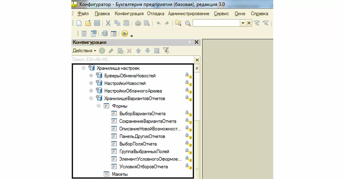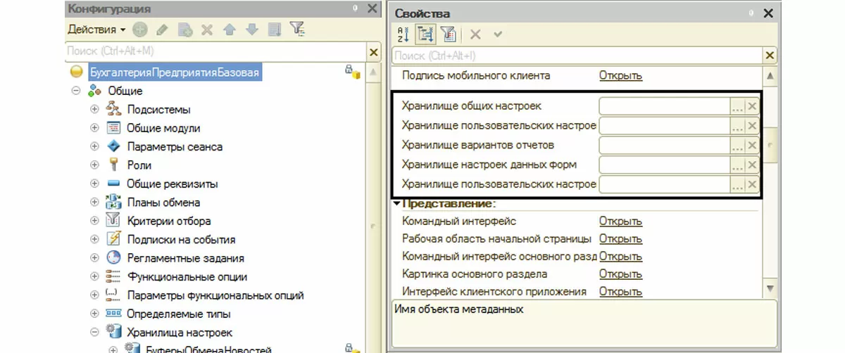Механизм «Хранилища настроек» как объект метаданных описывает порядок хранения настроек некоторых объектов. Откроем для примера программу «1С:Бухгалтерия предприятия 3.0» в конфигурационном режиме и развернем дерево метаданных. Нас интересует узел в разделе «Общие-Хранилища настроек».