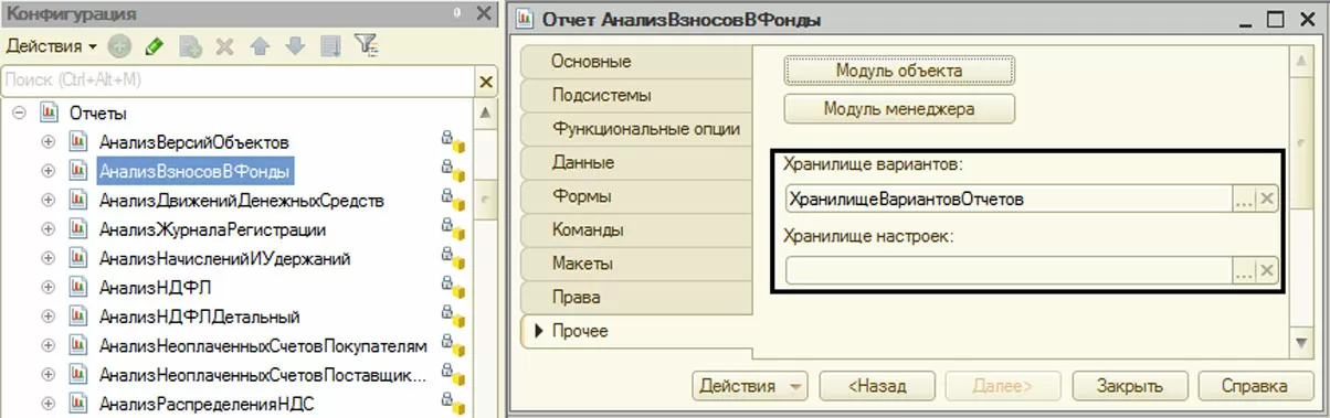 Если мы откроем в режиме конфигурирования свойства любого отчета, то на закладке «Прочее» мы увидим параметр, определяющий, какое хранилище задано для хранения установок выбранного объекта.