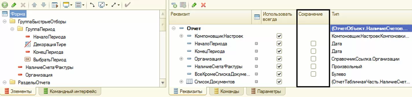 - В настройках. Чтобы воспользоваться этим вариантом, установим в списке реквизитов формы галку напротив сохраняемого реквизита в колонке «Сохранять».