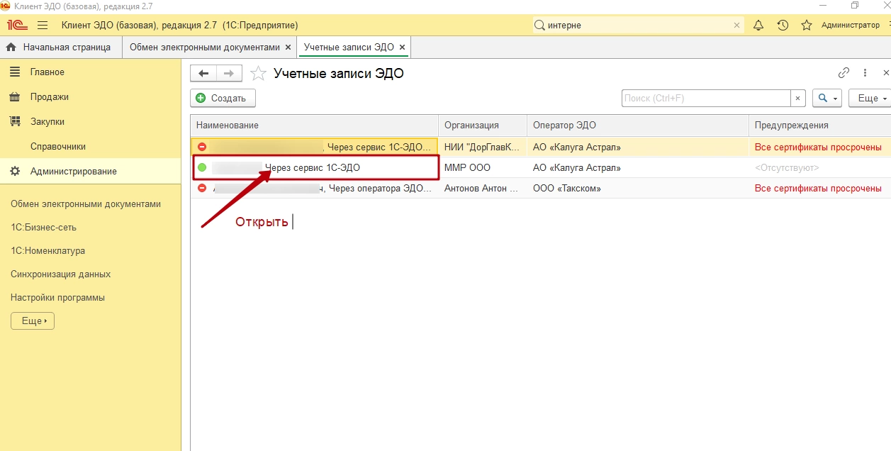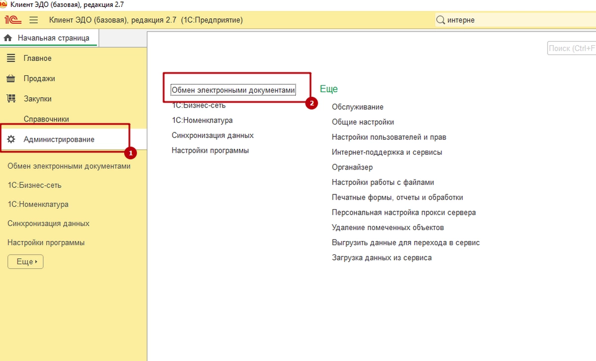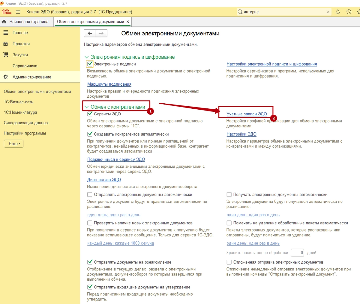 Для этого необходимо пройти в раздел «Администрирование-Обмен ЭД» и раскрыть обмен с контрагентами.