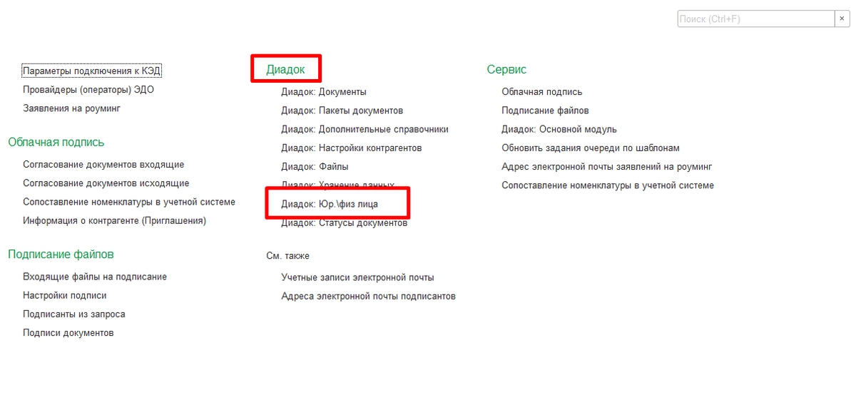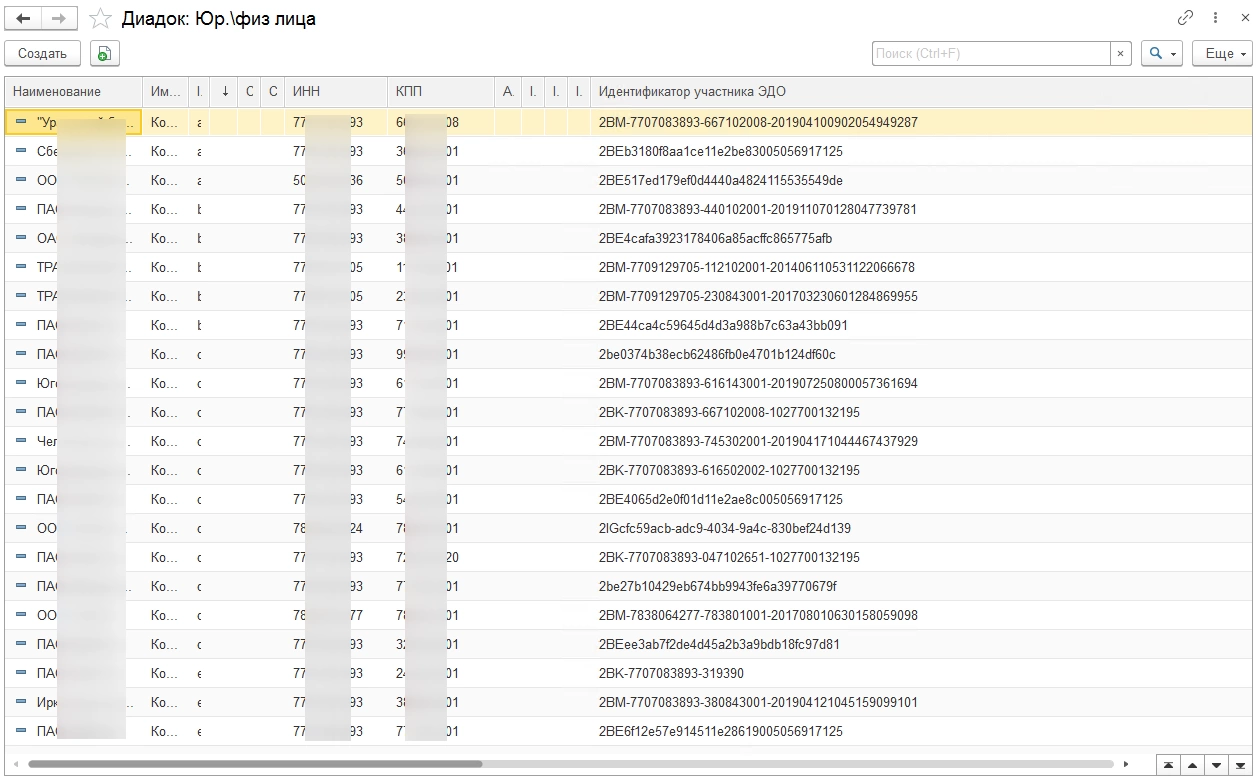 Если к вашей системе 1С подключен модуль Диадок, эту же информацию можно найти в разделе «Юр/физлица».
