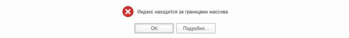 Чаще всего можно увидеть такое сообщение об ошибке, когда в коде идет обращение к элементу массива по индексу. И в том случае, если программист не предусмотрел проверку на количество элементов в коллекции, 1С будет получать значения. И рано или поздно наступит момент, когда в массиве элементы кончатся, а 1С продолжит пытаться получить значение. В этом случае и вылетит сообщение о том, что индекс элемента массива 1С находится за пределами.