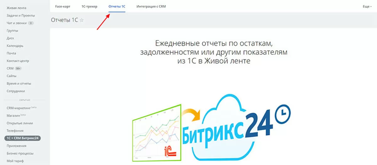 После включения синхронизации необходимо открыть вкладку «Интеграция с CRM» и найти «Отчеты 1С».