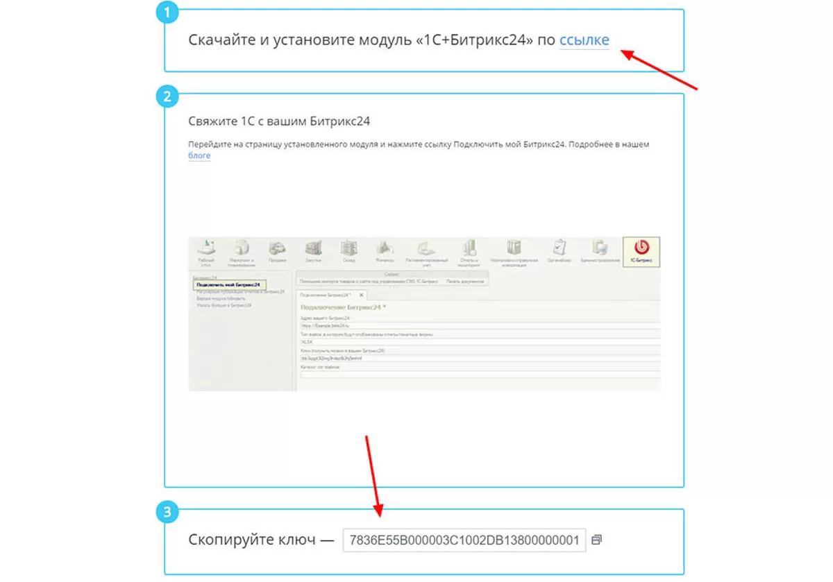 Затем откроется окно для скачивания модуля «1С+Битрикс24» и связи CRM с приложением для работы с отчетностью. Тут важно не забыть скопировать ключ.