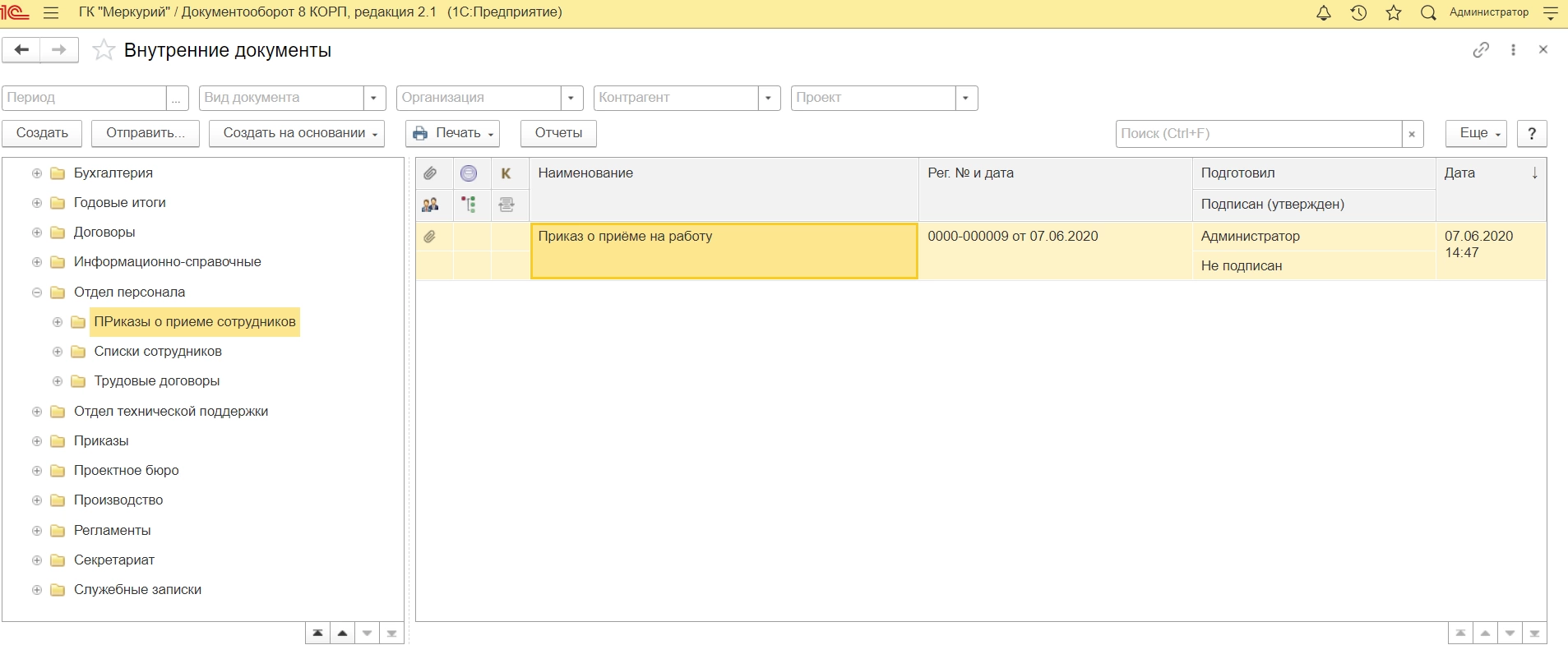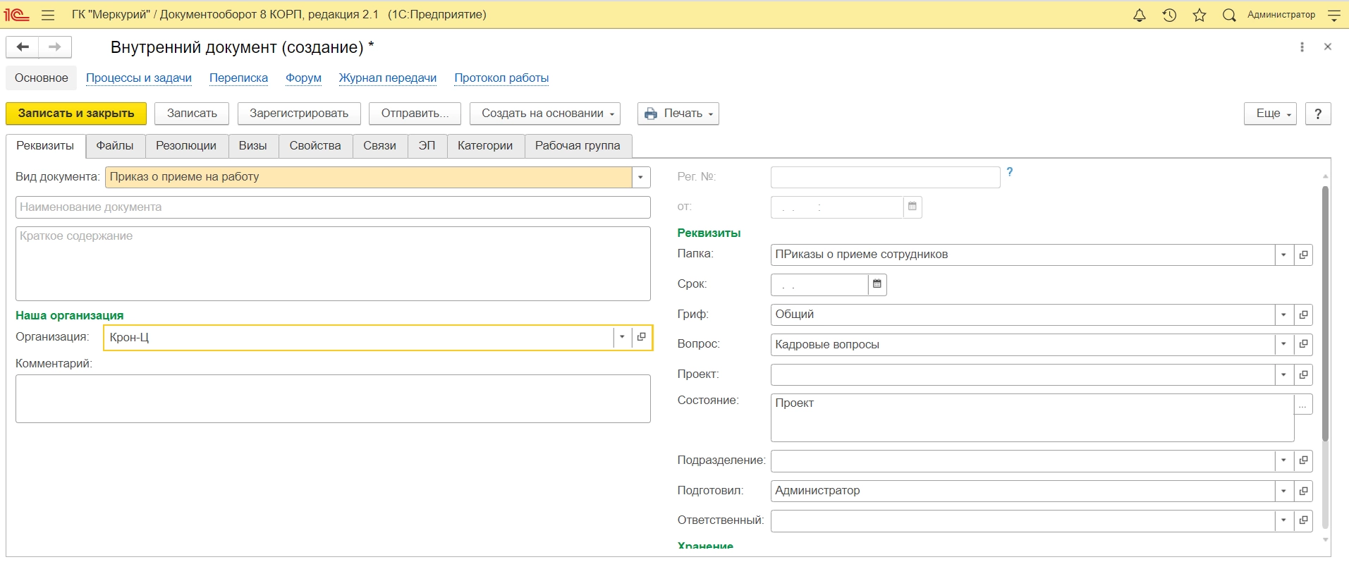 В 1С:ДО появляется соответствующий внутренний документ, с которым можно работать пользователям программы.
