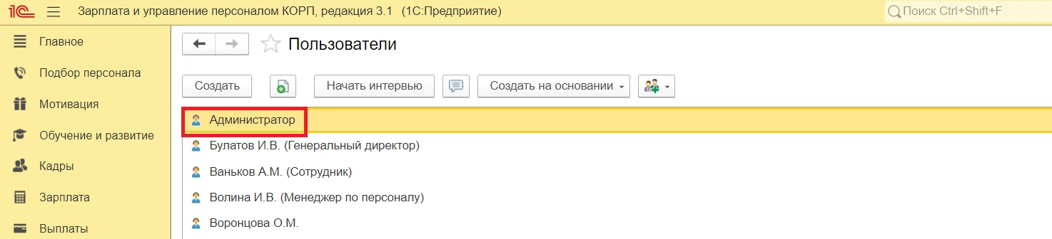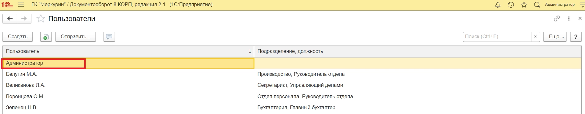 В первую очередь создаем идентичных пользователей в двух базах. Т.е. наименование пользователя должны быть полностью идентичными, в нашем случае это будет пользователь «Администратор».