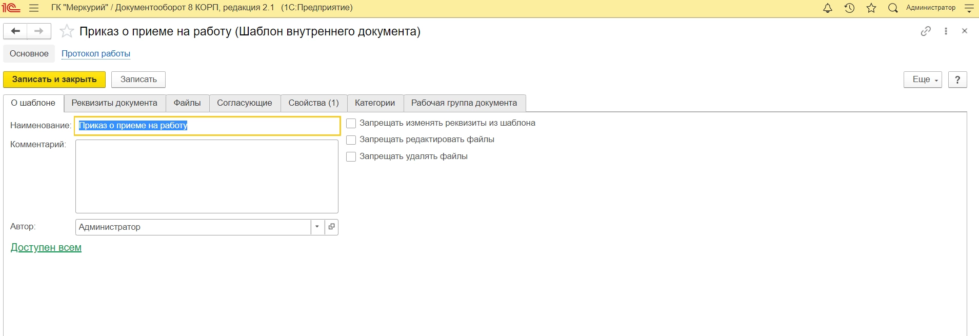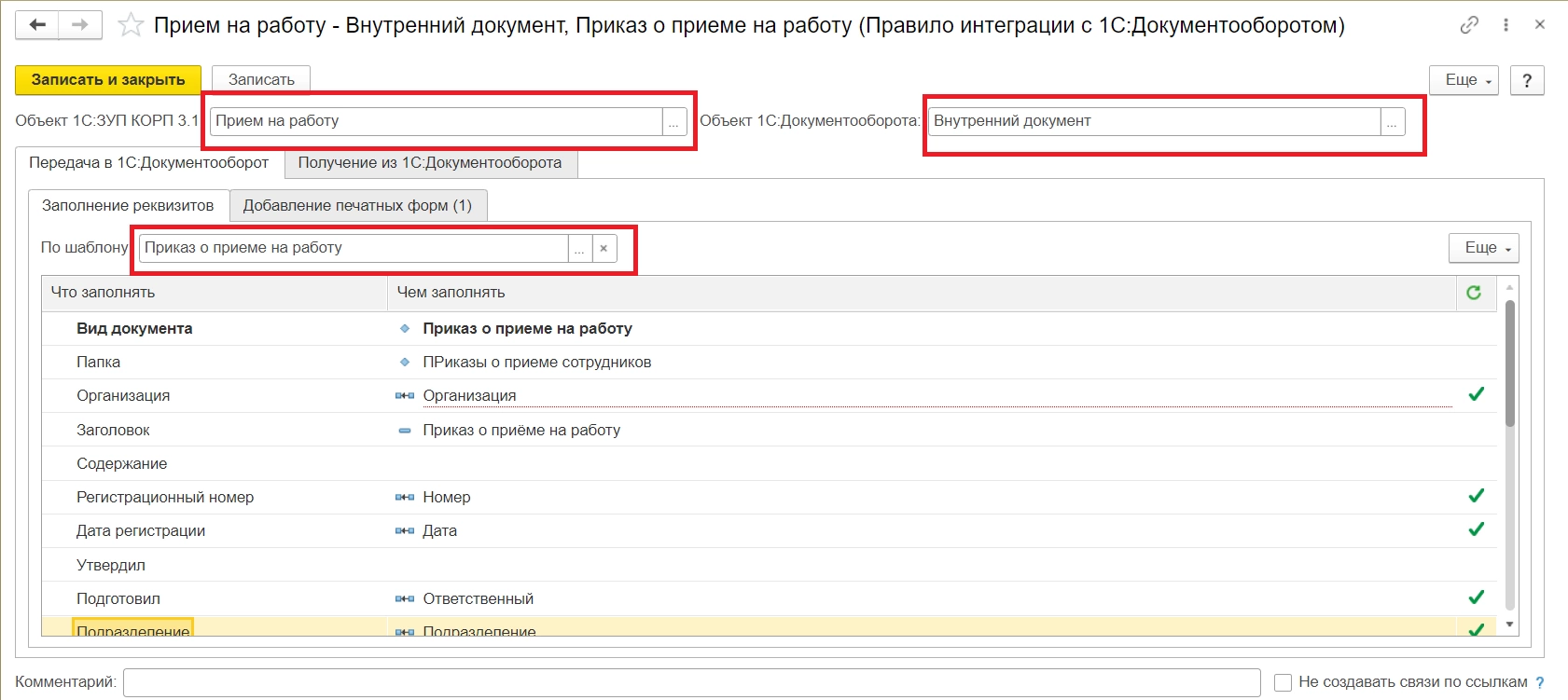Поскольку мы строим путь обмена для документа «Прием на работу», настроим соответствующее правило интеграции. Создадим внутренний документ и соответствующий ему шаблон в 1С:Документооборот в папке «Отдел персонала».