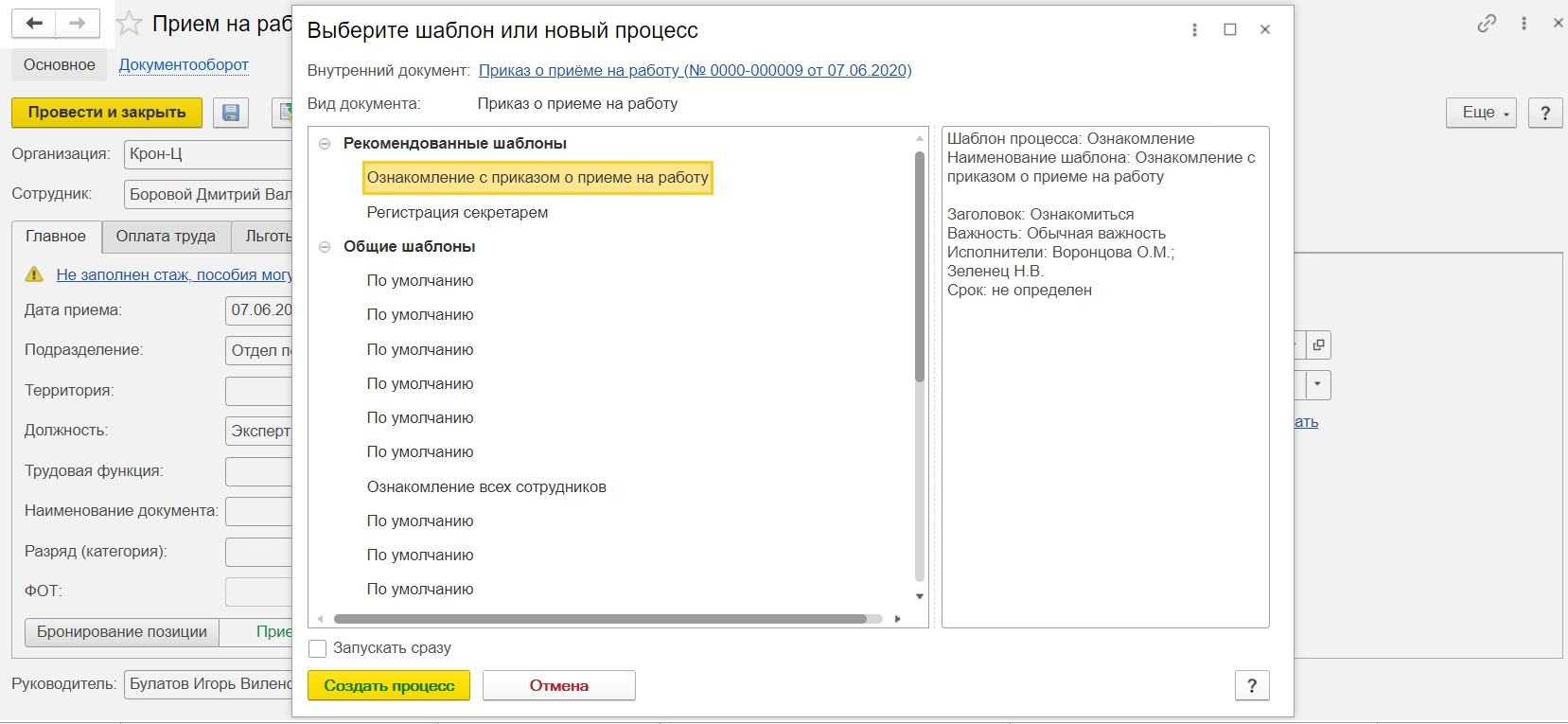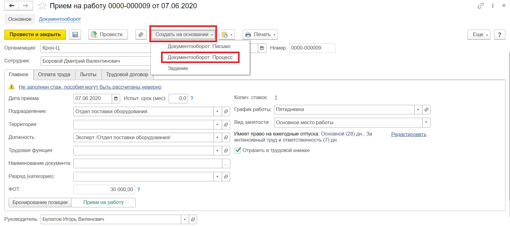 Для проверки работы правила, по которому работает интеграция, создаем документ «Прием на работу» в 1С:ЗУП, нажимаем «Создать на основании» и выбираем «Создать процесс».