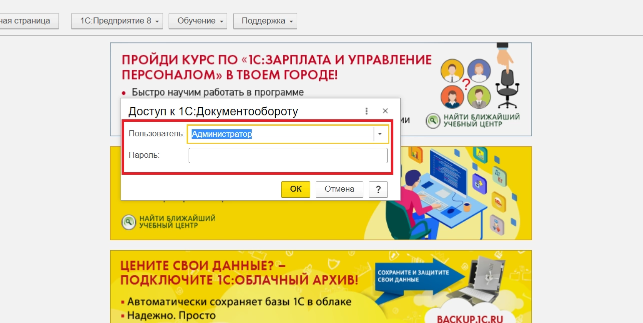При запуске 1С:ЗУП всплывает окно с выбором пользователя и вводом пароля. В нашем случае – «Администратор» и без пароля. Нажимаем «Ок» и проверяем нет ли ошибок, например, проблем, связанных с публикацией базы 1С:ДО на веб-сервере. Если таковые имеются, система выдаст код ошибки, по которому можно диагностировать проблему интеграции.