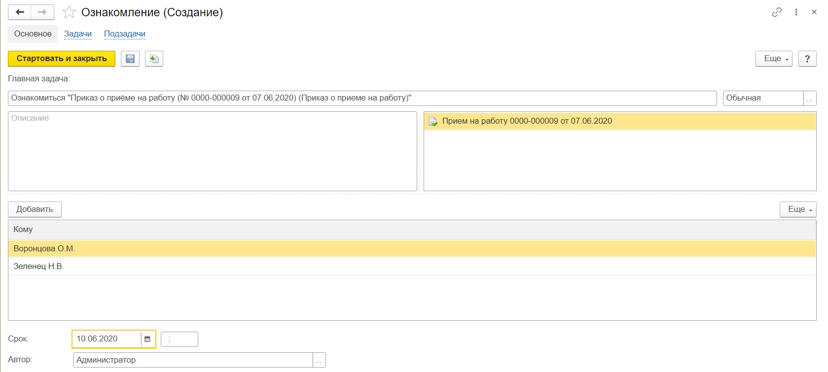 Действия по настройке делятся на две части: настройка на стороне ЗУП и настройка на стороне ДО. В качестве примера приведем ситуацию, когда пользователь 1С:ЗУП создает документ «Прием на работу», а в 1С:Документооборот необходимо запустить несложный процесс ознакомления пользователей с данным документом.