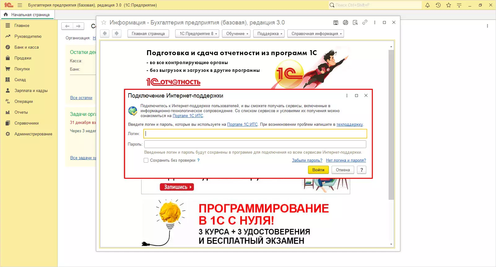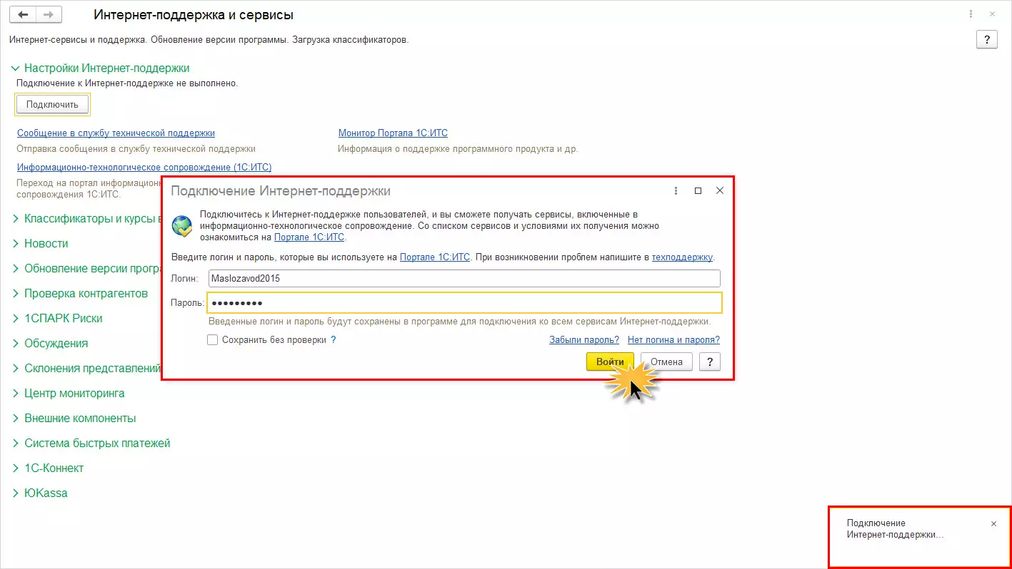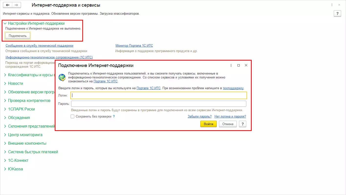 Если такое окошко не появляется, то второй способ – активировать поддержку, указав данные для входа на портале 1С через меню.