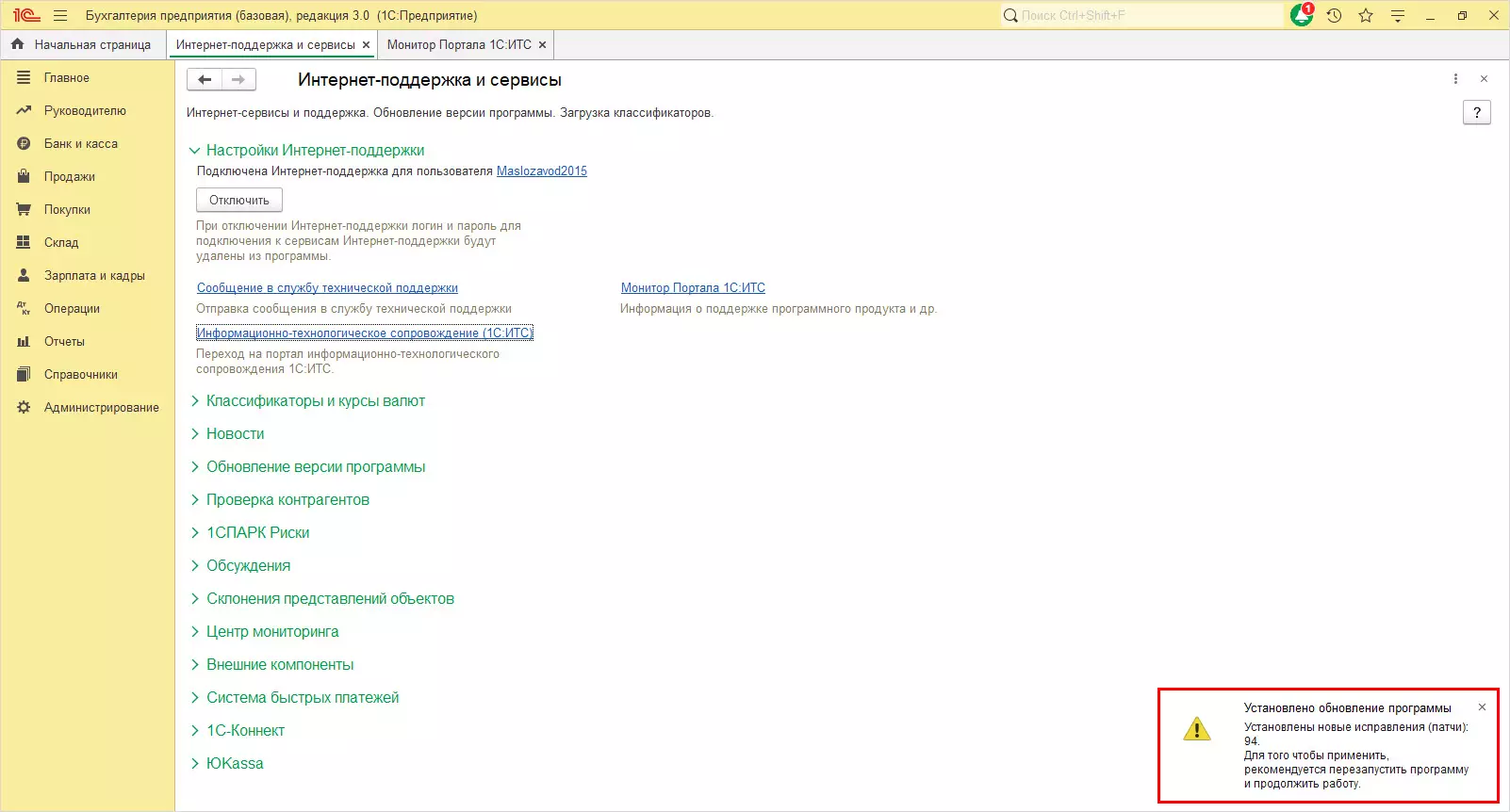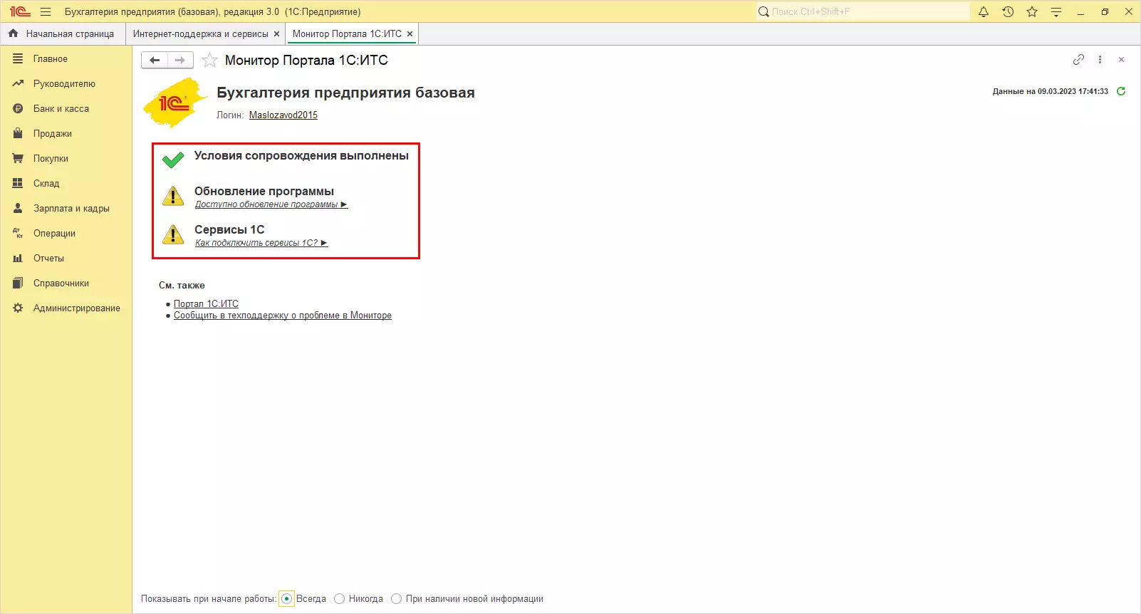 - Перейти к Монитору Портала 1С:ИТС, где после проверки условий сопровождения можно обновить программу.