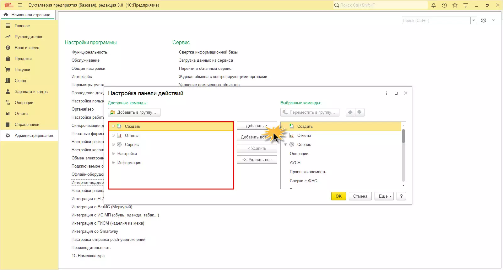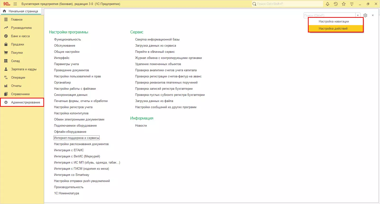 При отсутствии пункта Интернет-поддержка и сервисы в разделе Администрирование, загляните в настройку, нажав «шестеренку» справа (верхний угол окна) и далее Настройка действий.