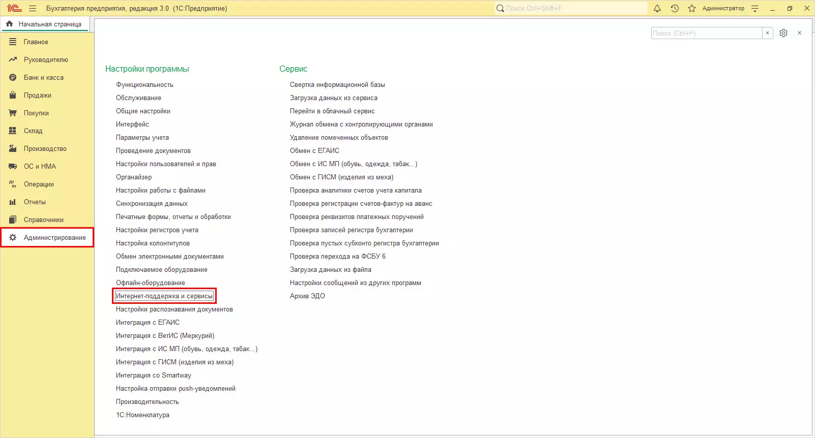 Шаг 1. Перейдите в раздел Администрирование – Интернет-поддержка и сервисы.