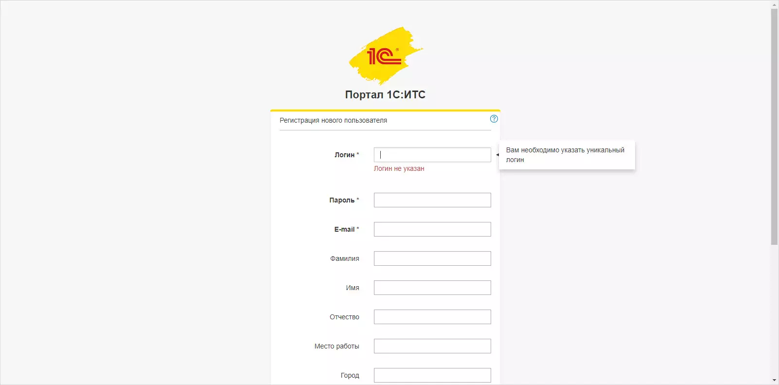 Далее система переведет к регистрации, где после заполнения всех полей открывается кабинет пользователя 1С.