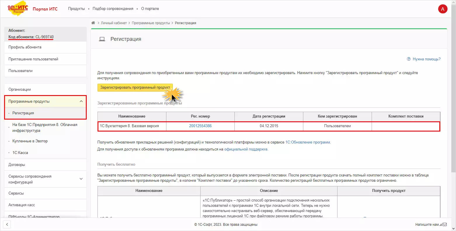 Заполнив личные данные, отдельно регистрируется программный продукт. Абоненту присвоится код. Эти данные необходимы, если пользователю понадобится обслуживание и техподдержка 1С.