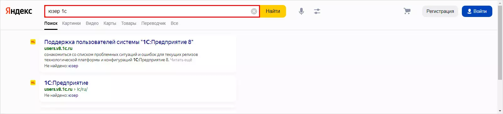 Второй вариант – ввести в строке поиска любого браузера фразу «юзер 1С» и первыми строками в результатах поиска будет сайт поддержки пользователей 1С.
