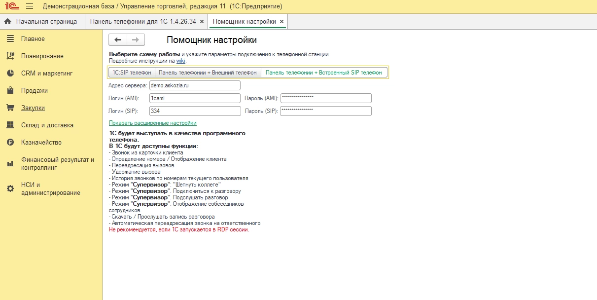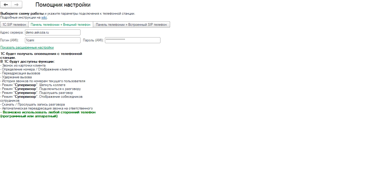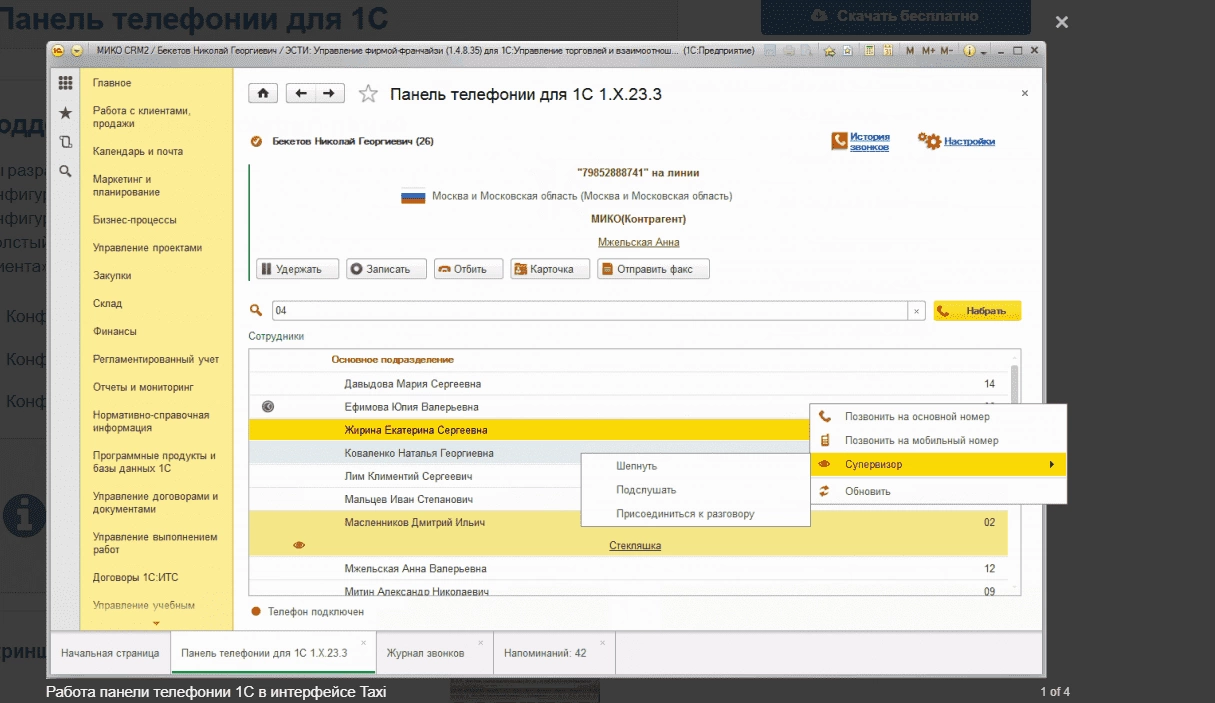 Имея определенные права, можно отслеживать, слушать, записывать разговоры, присоединиться к разговору, шепнуть оператору. До соединения с абонентом панель отображает данные того, кто звонит, при этом выводя всю информацию о контрагенте, его задолженности и другие данные. При этом программа не изменяет исходную конфигурацию 1С.