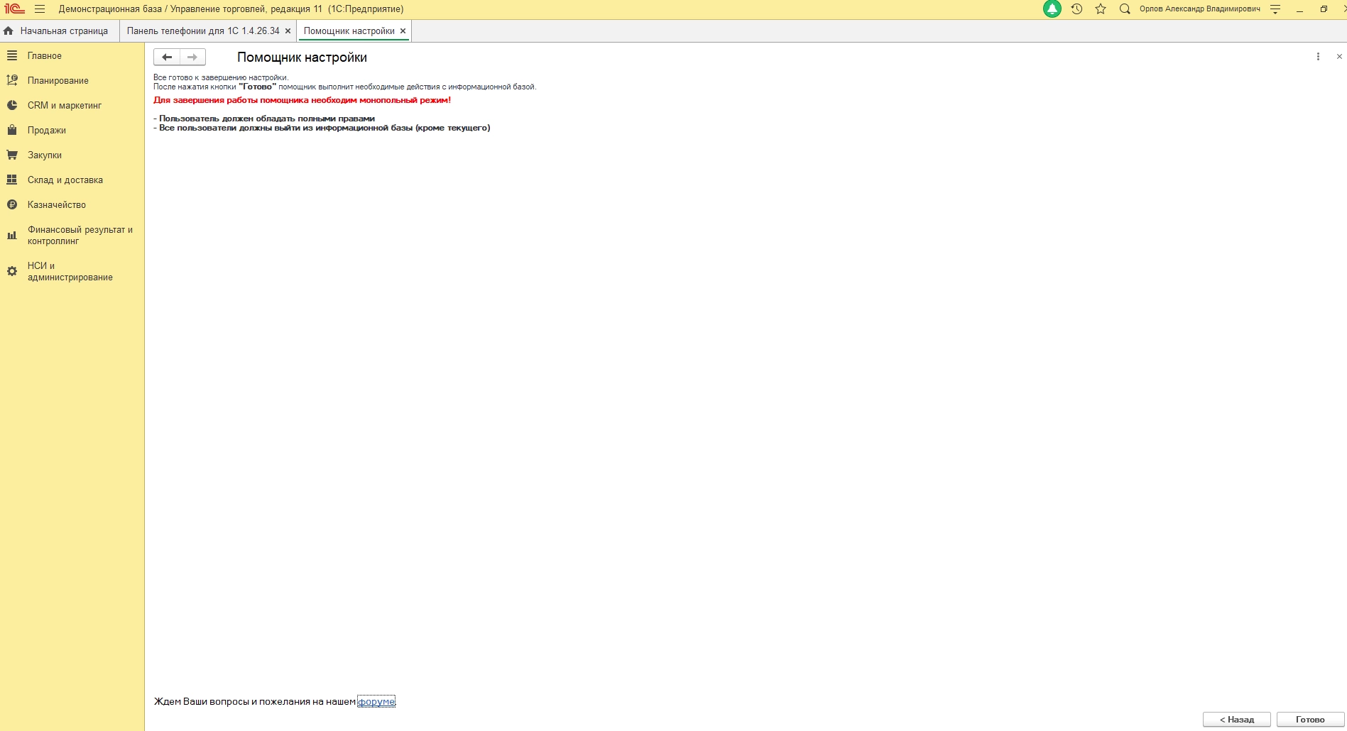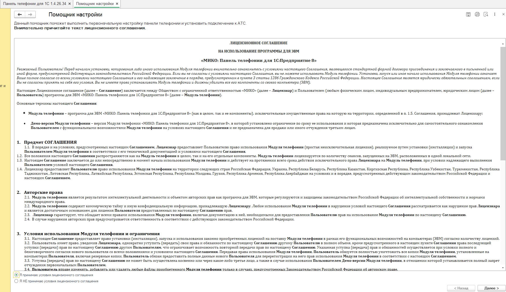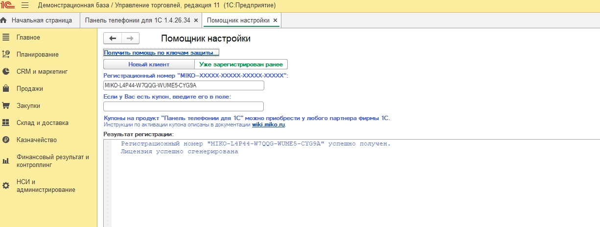 Программа автоматически генерирует и присылает на электронную почту регистрационный номер активации пробного периода использования панели телефонии – 30 дней.