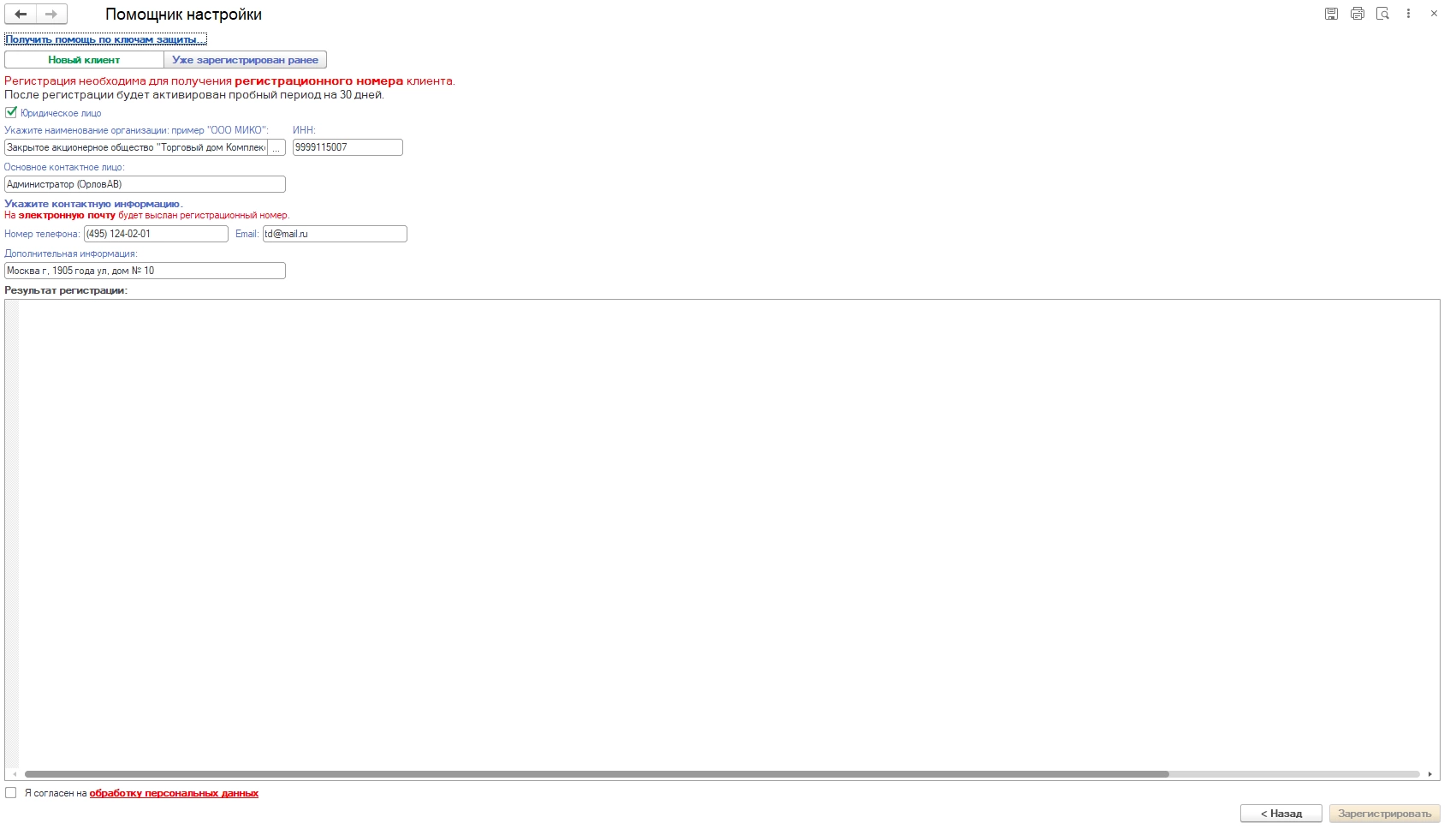 В карточке заполняются регистрационные данные организации, которые автоматически подставляются из программы, и указывается адрес электронной почты.
