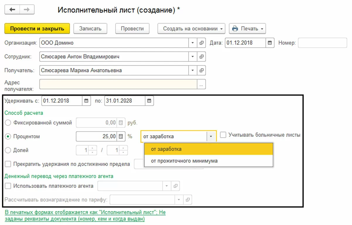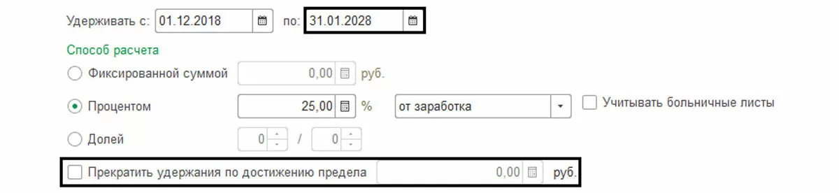 Расчет может представлять собой определенную сумму или процент (долю) от заработка или прожиточного минимума. Параметр «Прекращения по достижению предела» отвечает за автоматическую остановку выплат при достижении зафиксированной суммы.