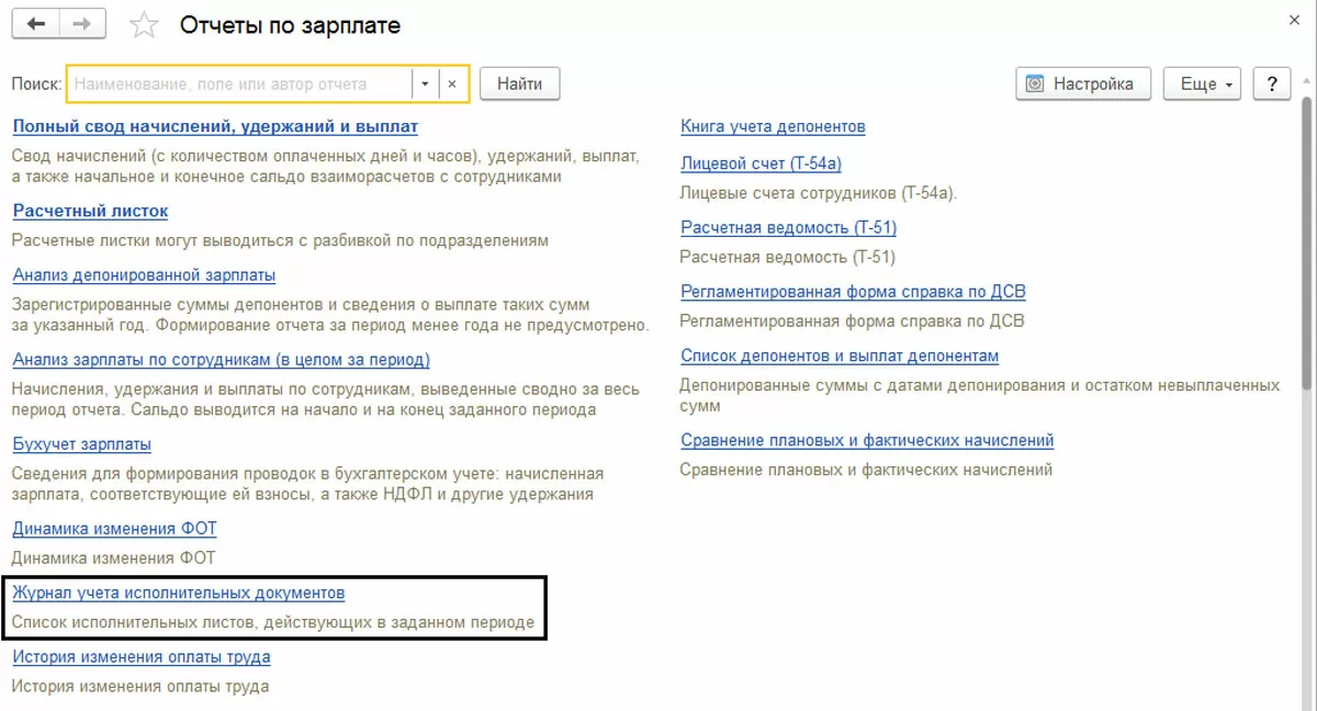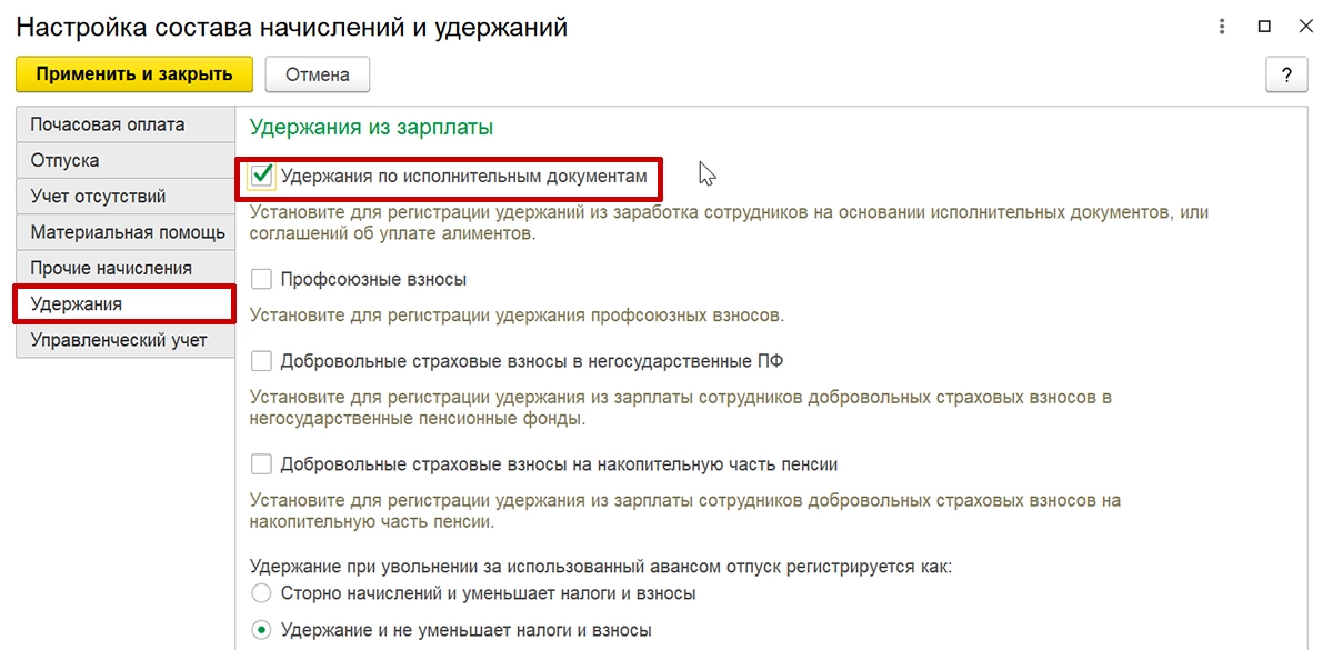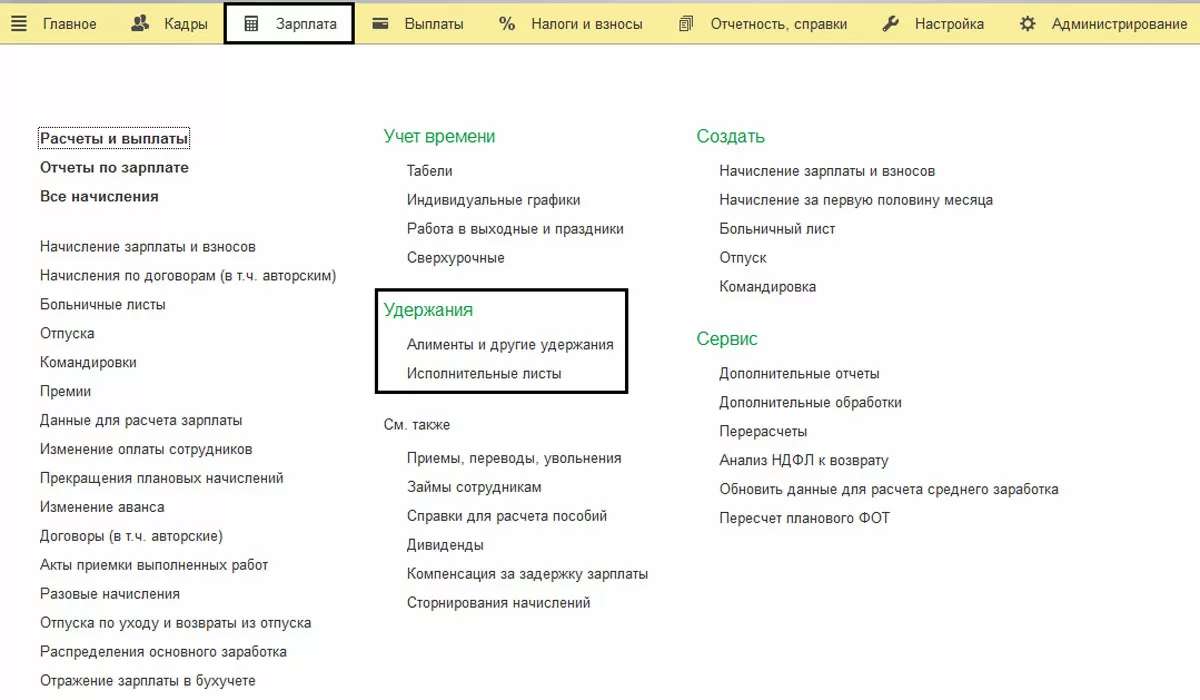 В результате применения этой настройки в меню «Зарплата» появится раздел «Удержания» и будут доступны два журнала – «Алименты и другие удержания» и «Исполнительные листы».
