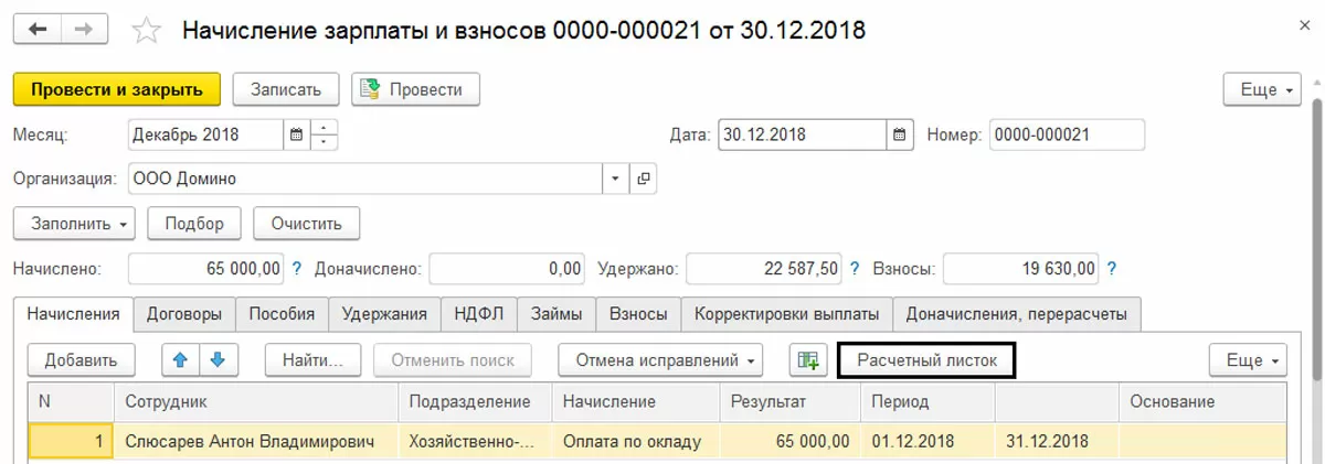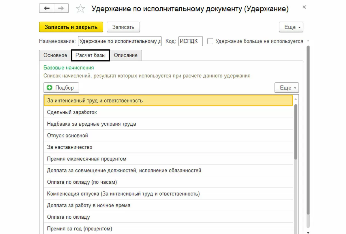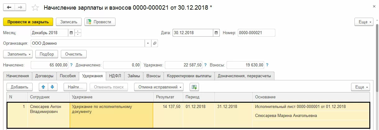 Заполнив все данные, сохраняем документ (кнопка «Провести и закрыть»). Хотелось бы обратить внимание, что при удержании используется расчет от базы, которая задается в настройках удержания (раздел меню «Настройки-Удержания»).
