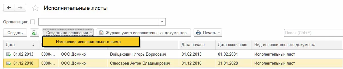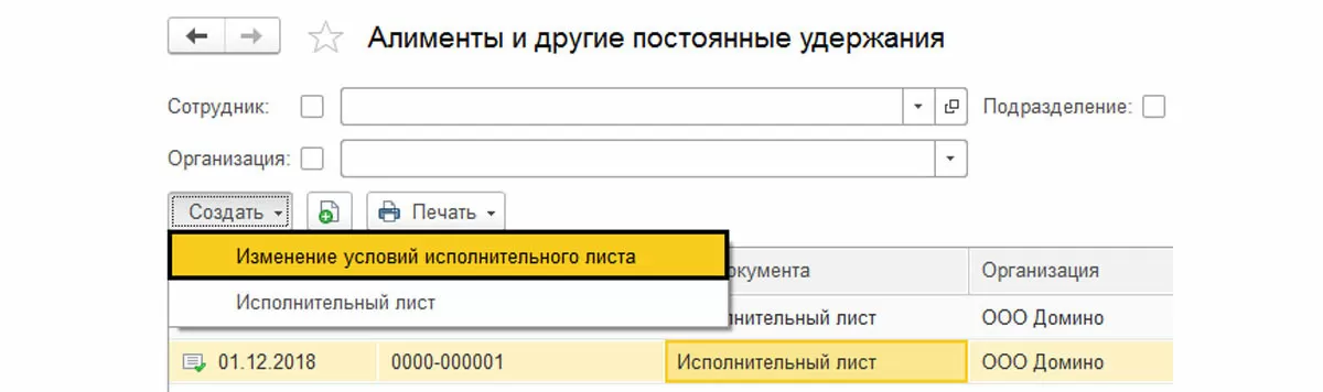 Еще один способ изменения условий выплат – создать «Изменения исполнительного листа» на основании.