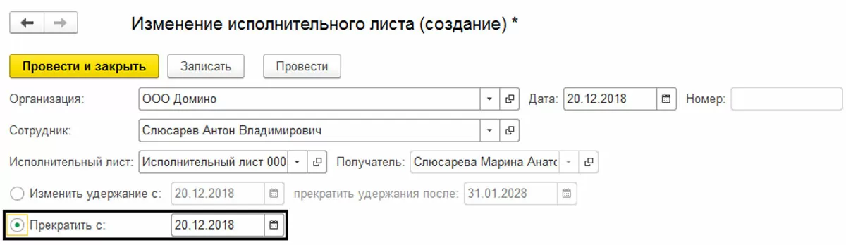 Если же мы дату окончания не устанавливали, или у нас изменились условия действия документа, то мы можем закрыть его или изменить условия с помощью специального документа, который можно ввести в этом же журнале «Алименты и другие постоянные удержания».