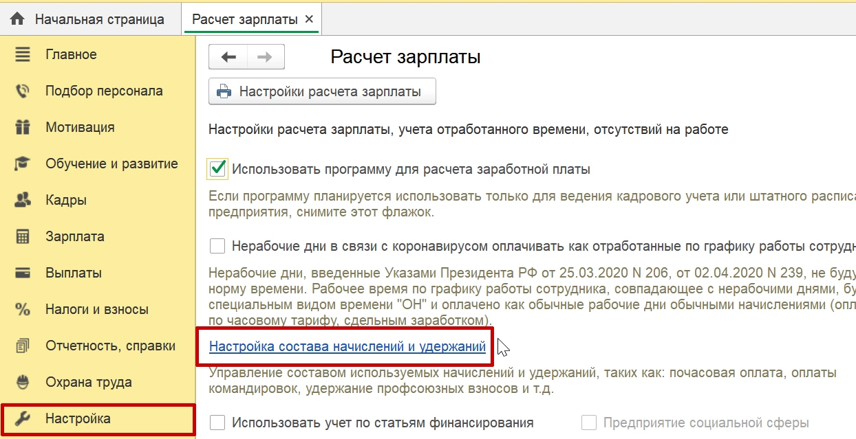 Перед вводом надо зайти в «Настройки-Расчет зарплаты», перейдя по гиперссылке состава начислений и удержаний.