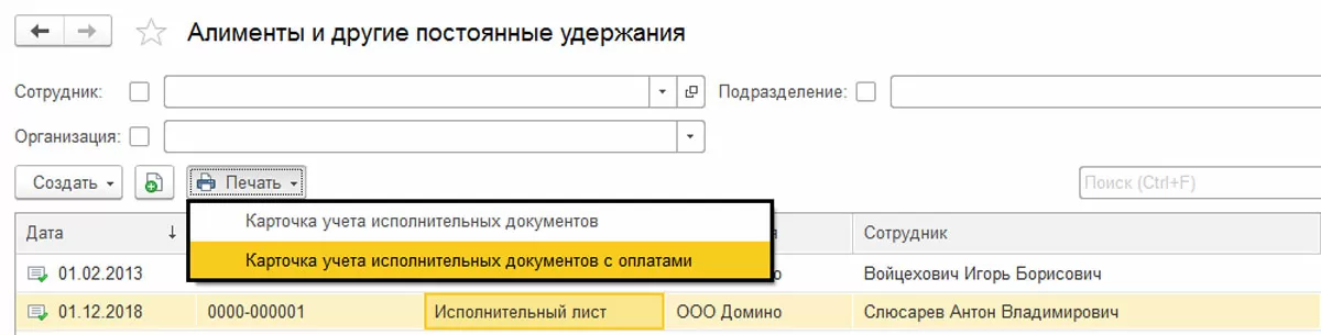 В журнале «Алименты и другие постоянные удержания» для печати доступны две карточки учета.