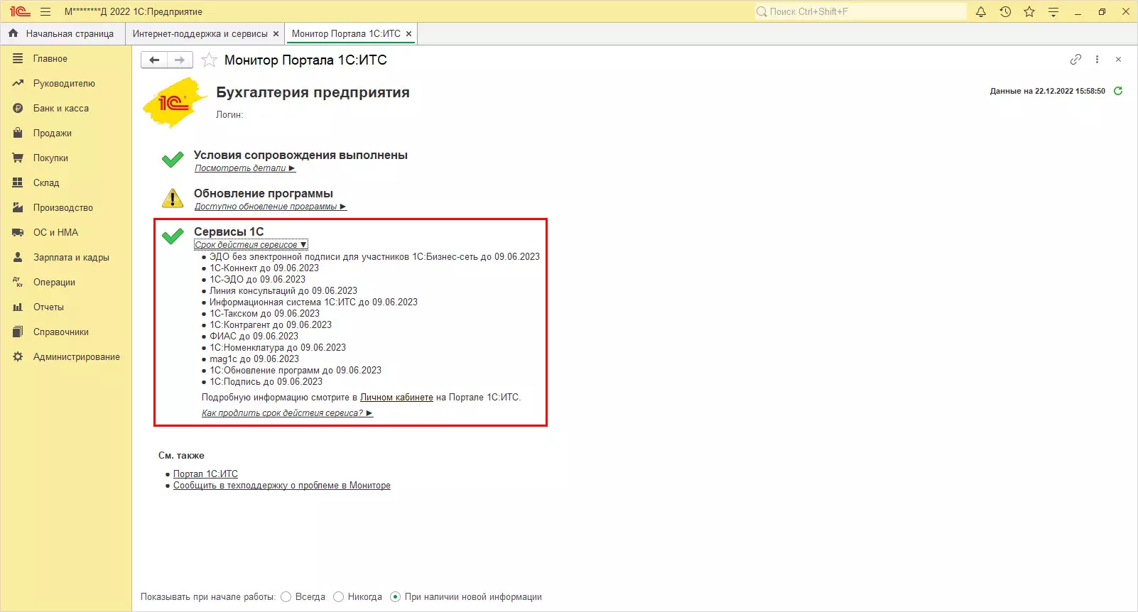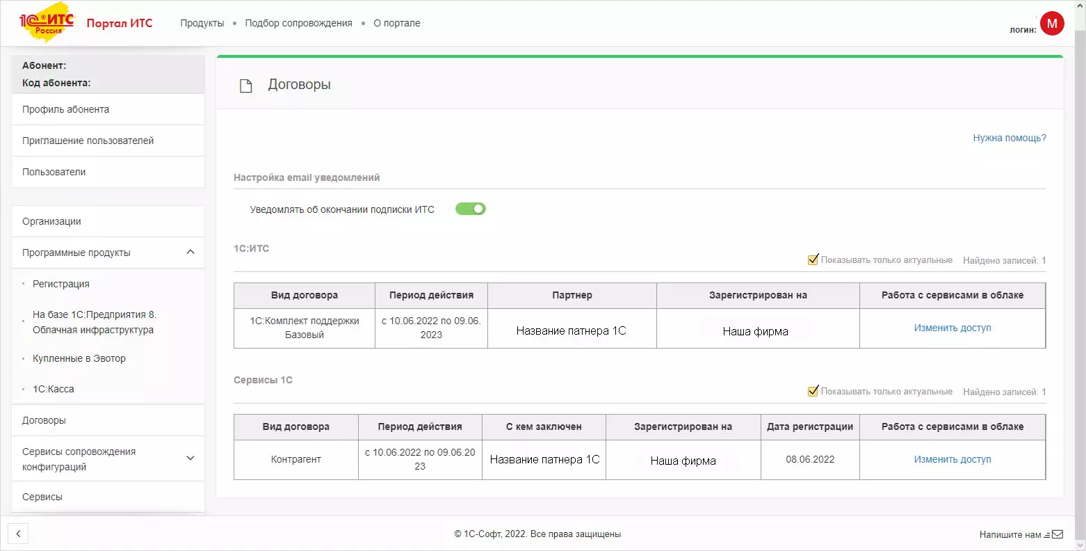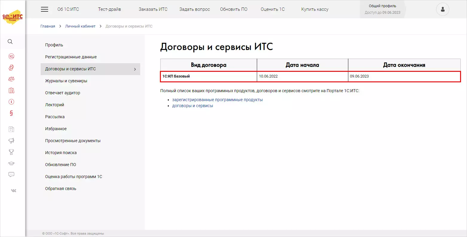 В разделе Договоры и сервисы ИТС отображается информация о действующем договоре и его сроках. По гиперссылкам можно посмотреть информацию о заключенных договорах поддержки и подключенных сервисах.