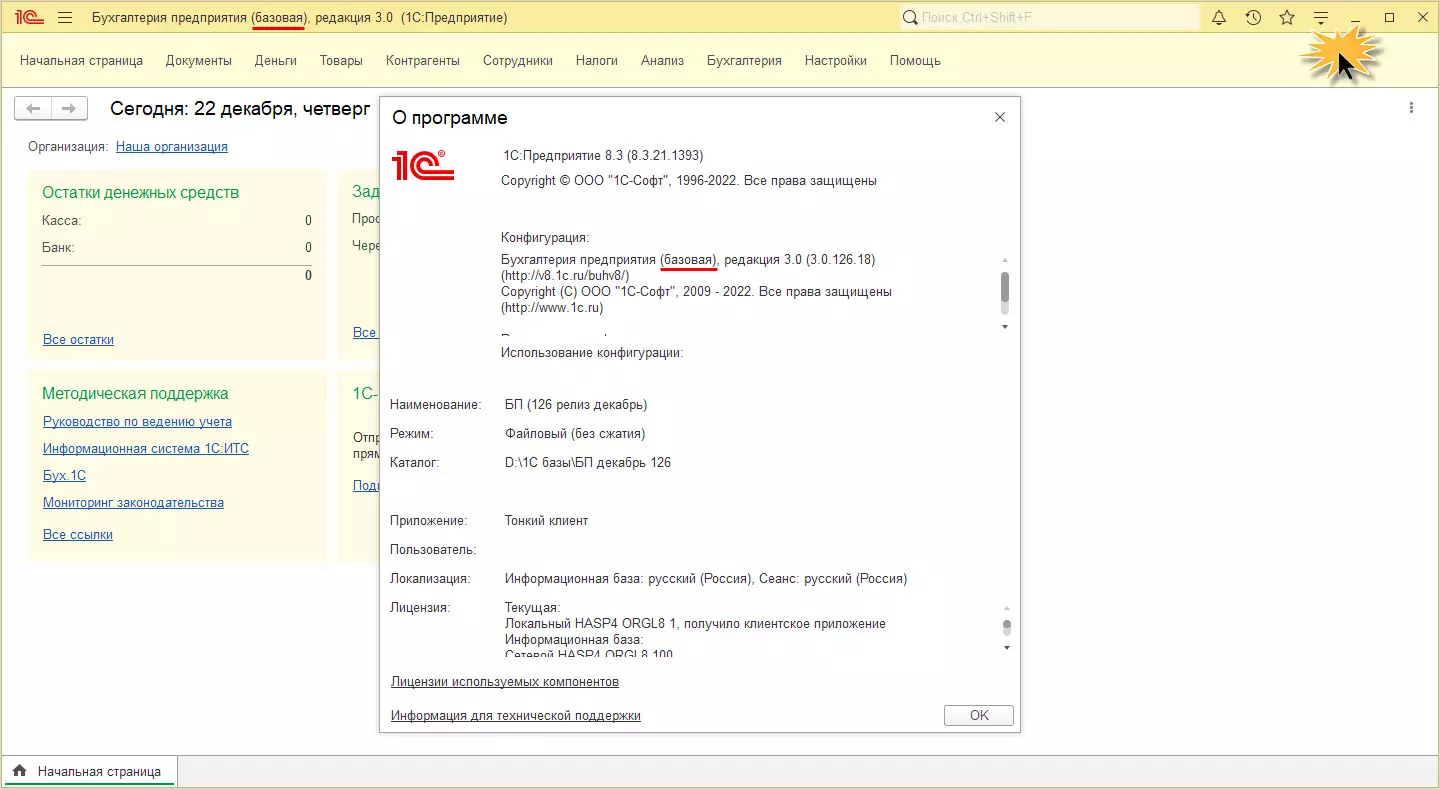 - Нажать на кнопку-стрелку в верхнем правом углу окна программы и в выпадающем меню выбрать пункт «О программе». Здесь точно будет указано название вашей конфигурации и стоять отметка о том, что она базовая.
