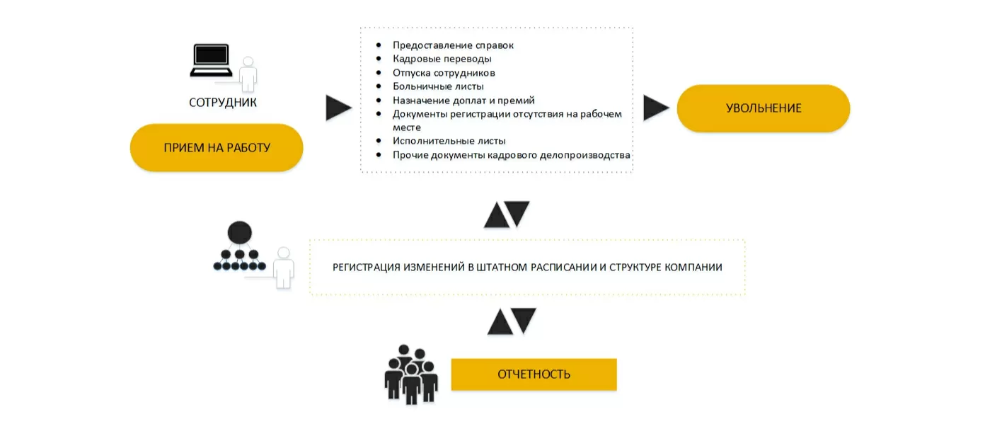 Кадровый документооборот не существует в вакууме, являясь частью бизнес-процессов компании. Помимо департамента расчета заработной платы и бухгалтерии, с кадровиками взаимодействуют сотрудники отделов охраны труда, нормирования, подбора персонала. Взаимодействие через бумажные документы или различные Word-файлы может привести к их потере или несинхронному ведению, когда, например, один отдел использует актуальный список кадровых переводов на начало месяца, а другой – предыдущую версию документа.