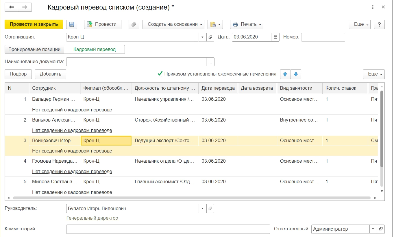 По аналогии с документом «Приема», в программе можно оформить «Кадровый перевод списком», где реализован более удобный способ учета кадровых движений, носящих массовый характер.
