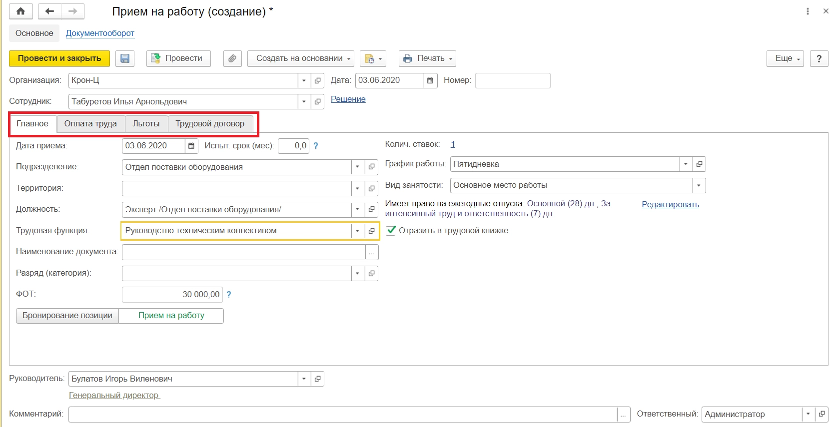 Представим, что в нашу компанию поступает новый сотрудник. Естественно, нам в первую очередь придется оформить документ «Прием на работу».