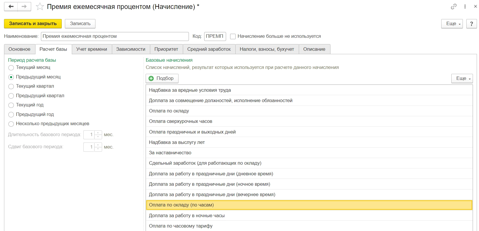 В этом документе можно выбрать вариант назначаемого начисления (в нашем случае – ежемесячная премия, базу для расчета которой можно откорректировать), перейдя к этому виду расчета из документа. Т.е. можно сделать расчет премии не только от оклада, ни и от оклада и надбавки за вредность.